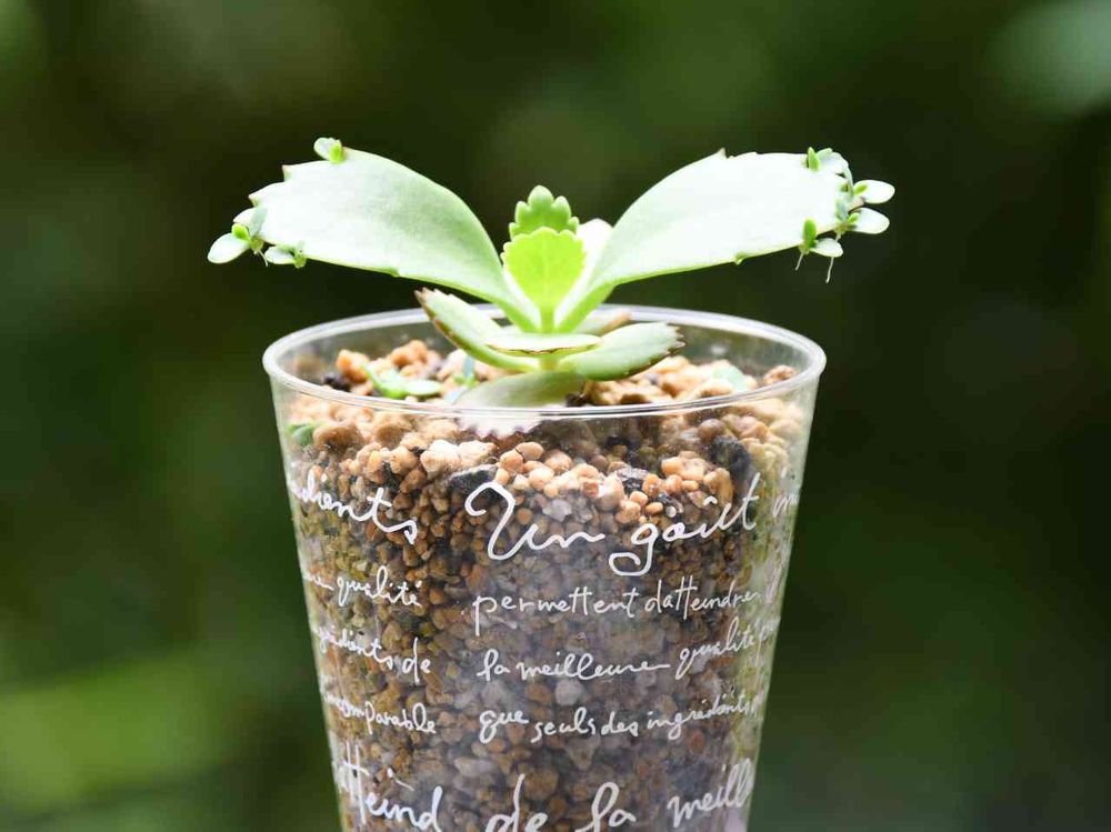 涼しげなゼリーパフェをいただいた後、容器の底に穴を開けて子宝草を植えてみました😄