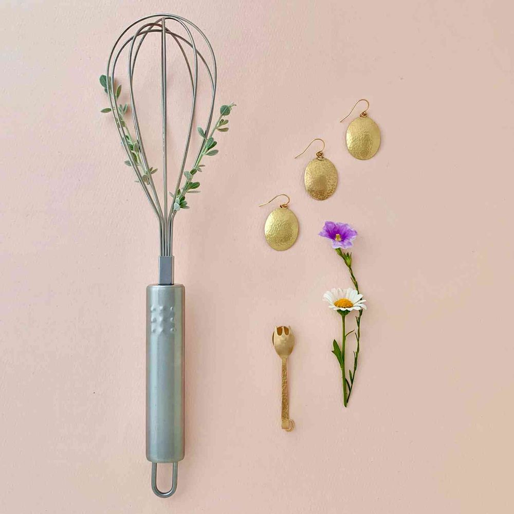 オレアリアリトルスモーキーをキッチンツールにアレンジ。その他のお花の名前を忘れてしまいました。ドロップピアスはスペアも製作してお届け。