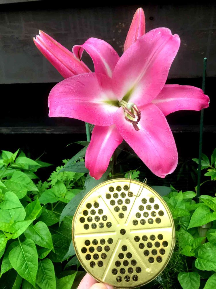 やっと咲いてくれた〜❣️ガーデニングのお供、蚊取り線香のお皿との比較🌀人喰いそうな勢いの大きさ💦もはやコワイ😱