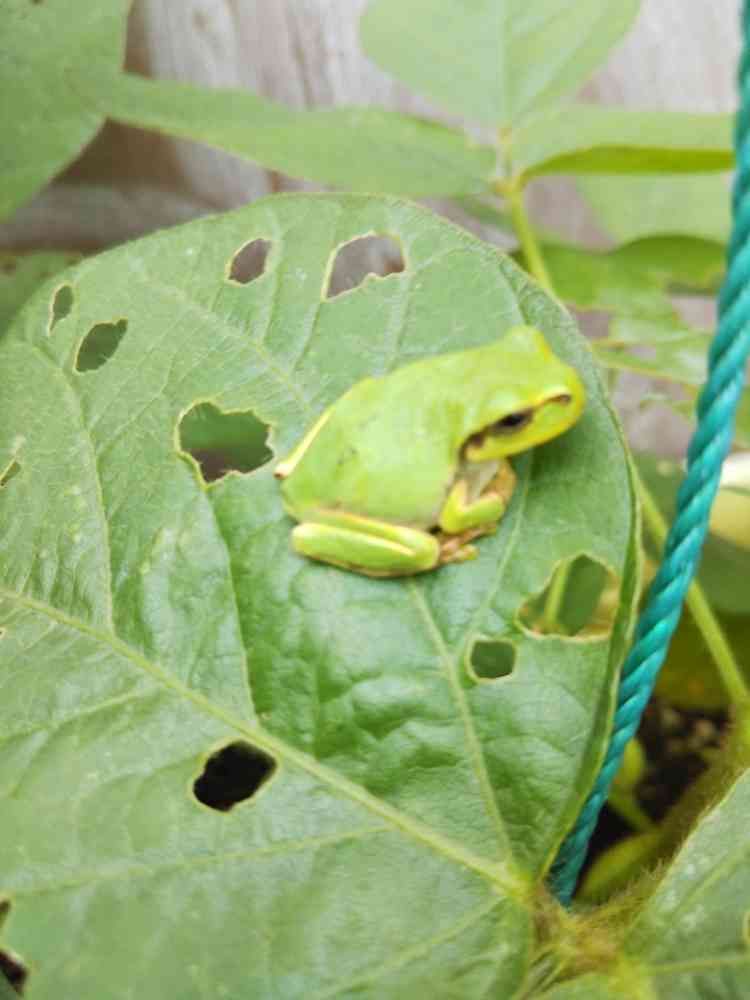 前の自宅の園芸達人も🥺間違いか、ササギとして小さい苗もらったが枝豆でした。ビール🍺のつまみ一回分にはなりそうかな⁉️農薬等してないから、芋虫から葉が食べられてましたが、枝豆番人にビッキ(蛙🐸)がいつの間にか来てました。ちょっとお腹がふっくらと、満腹の表情になってます。