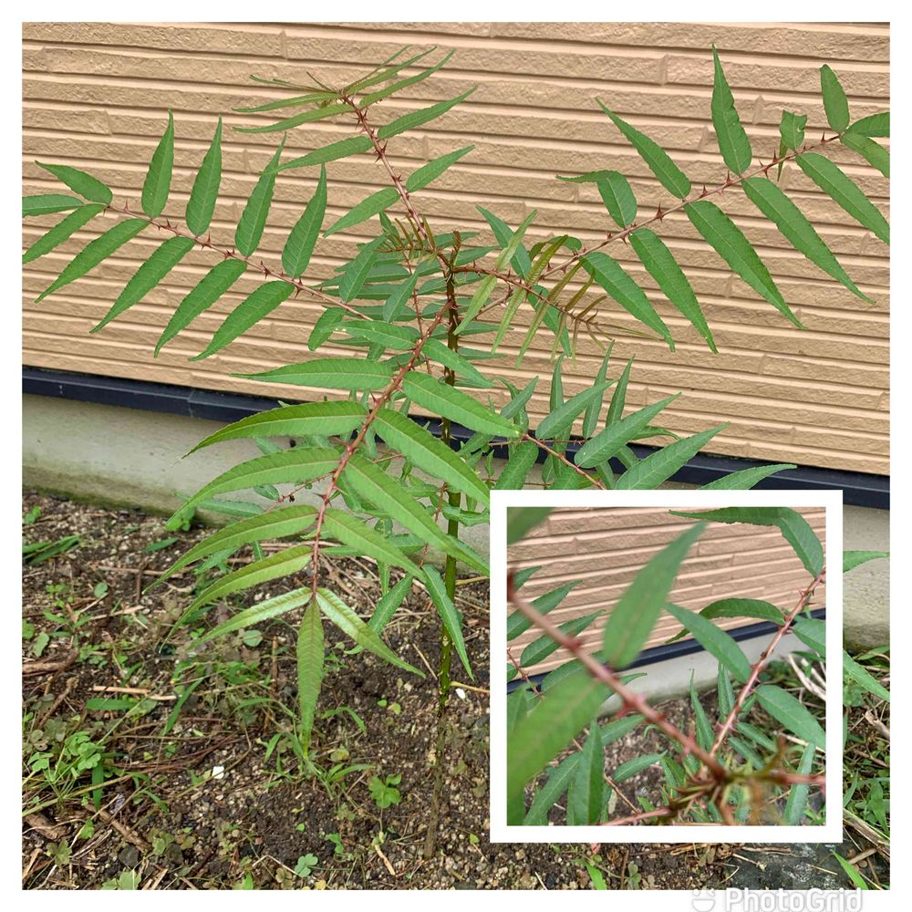 雨上がりに草引きしていたら知らない間に鳥が運んできたのかこんな苗木が育ってました。トゲがあります。