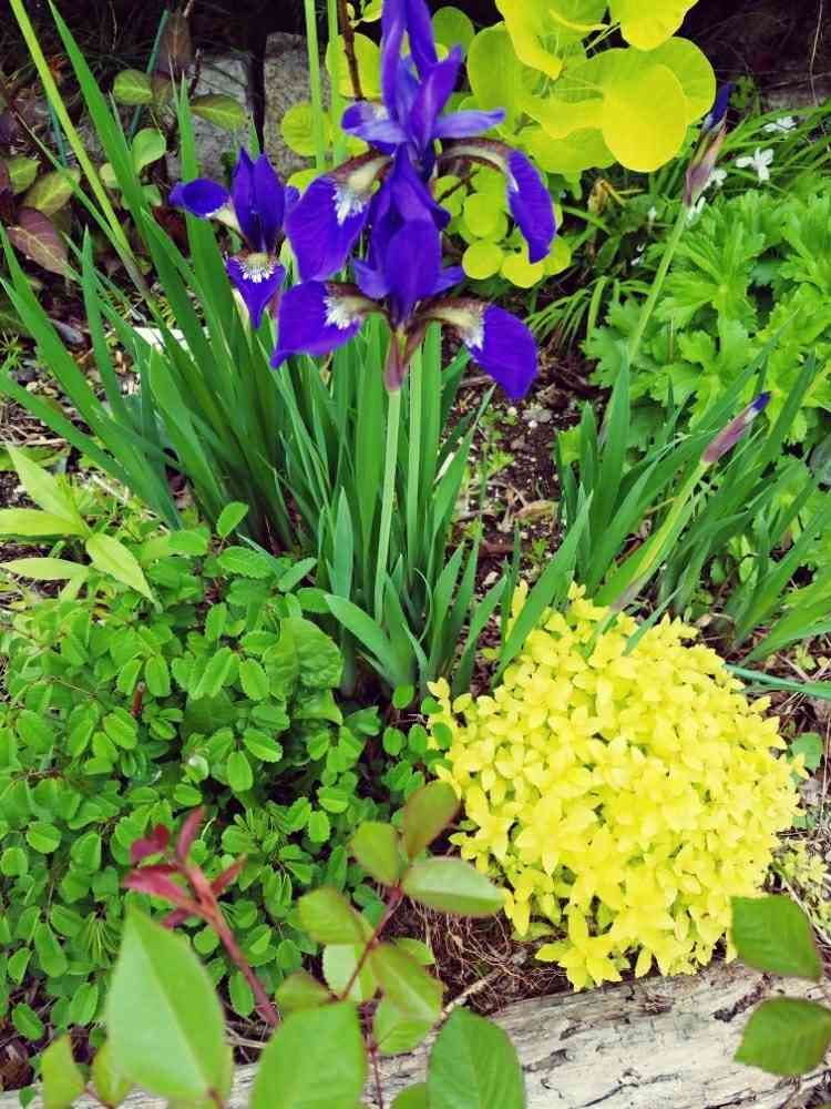 3寸あやめがやっと咲きました✨小さくて可愛いです♪3寸?1寸は3㎝ちょっとだから3寸て10㎝位?いやいや、確かに普通のあやめより小さいけど、どう見ても30㎝はあるよ😓影に満州小あやめが隠れてるけど、それこそ10㎝位だし、3寸と言う名前に釣られて植える場所間違えたわ😥(普通は小さな満州小あやめを前に植えるべきだったわ💦