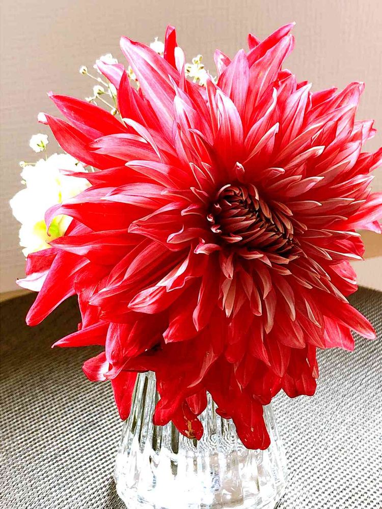 カーネーションとかすみ草が居心地悪そうに思えるほどの、ダリアの存在感。