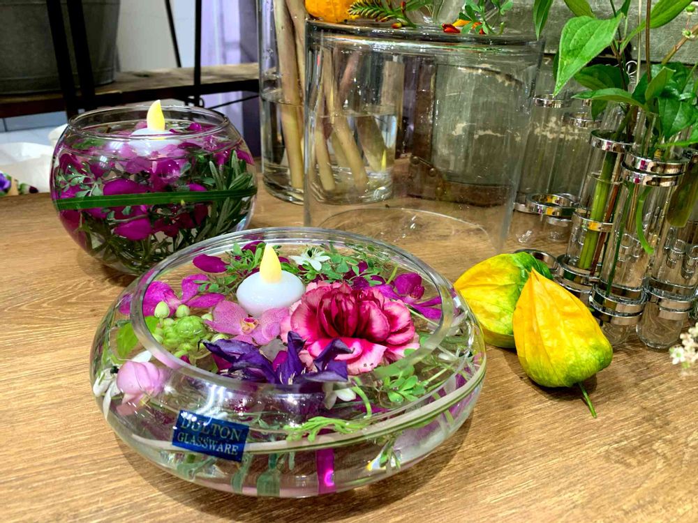 本日訪れたHibiya-Kadan Style(日比谷花壇)の店頭ディスプレイ💗フローティングキャンドルとお水に浮かべたお花の贅沢なアレンジメント。
