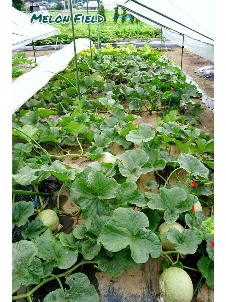 赤色果肉マスクメロンの熟期は黄緑色果肉より10日長い57日、収穫はお盆前後になる。何とかつるをもたせて、甘いメロンを収穫したい。🍈🧺🛒😋