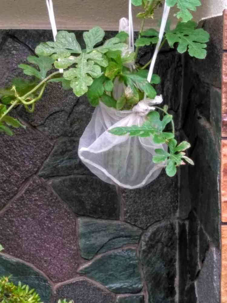 朝の散策中に、通り道のお宅の、窓下の花壇に、西瓜が大きくなり、袋に入れられ、窓下に吊り下げられていました。