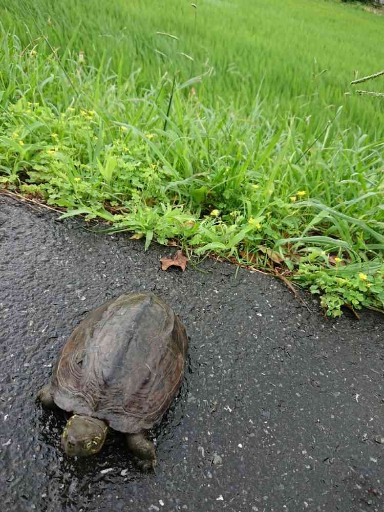 家の脇の田んぼから大きなかめが道路横断中👀❕