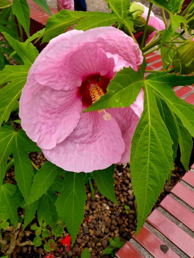 お出かけ先の街の会社のビルの植え込みに、大きなフヨウの花を見つけました😊