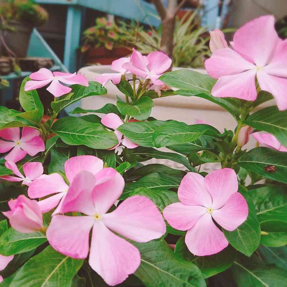 ニチニチソウ、紫色のオーソドックスなのは年中あちこちで咲いてるんですが、このピンク色に一目惚れでした❤️
