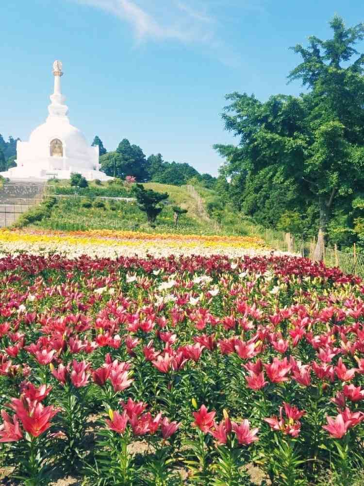 鴨川市の日蓮宗大本山清澄寺奥の妙法寺仏舎利塔前でユリの鑑賞会。イベントは明日らしい…残念。