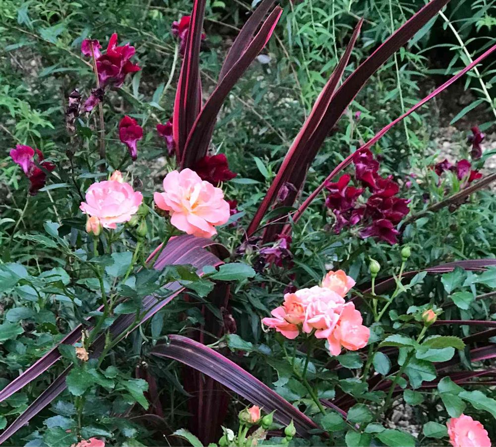 地植えのコルジリネ、金魚草・ブラックプリンス、そしてドリフトローズ・アプリコット🍑