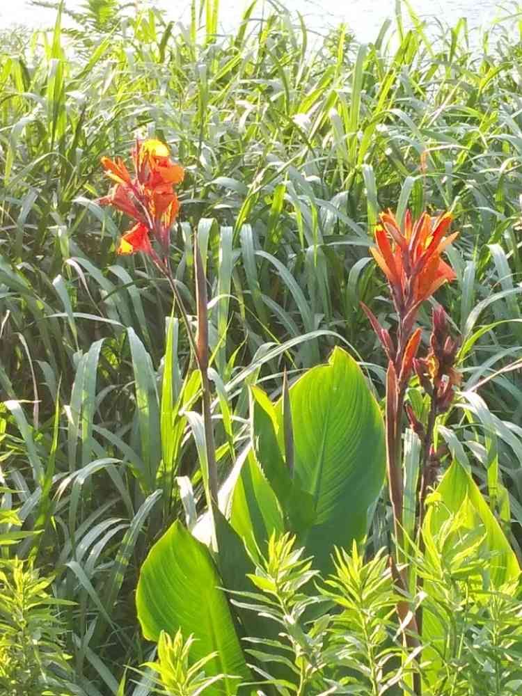 久しぶりに河川敷へ出かけました。川のそば、土手の下の草むらに、カンナがひときわ目立つ鮮やかな花を咲かせていました。乾燥に強く、一方で、根が水に浸かるような所でもよく育つとのこと。暑い夏でも、びくともしないどころか、むしろ暑い方が生育が活発になるそうな、夏向きの花