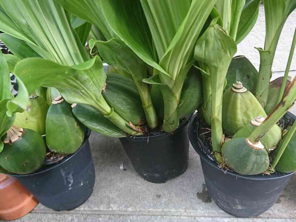 4月にシワシワのチリチリバルブでお迎えしました。パッツンパッツンでデブりんこになってきましたよ、リカステ軍団。鉢増ししたのに大きさ間違えちゃった。
