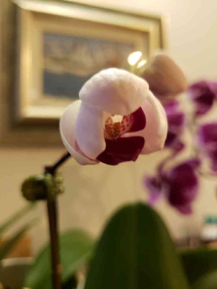 一昨日、黄色に筋膜入りの胡蝶蘭とともにお持ち帰りした、ワンコイン名無しの胡蝶蘭さん😊、開花途中。