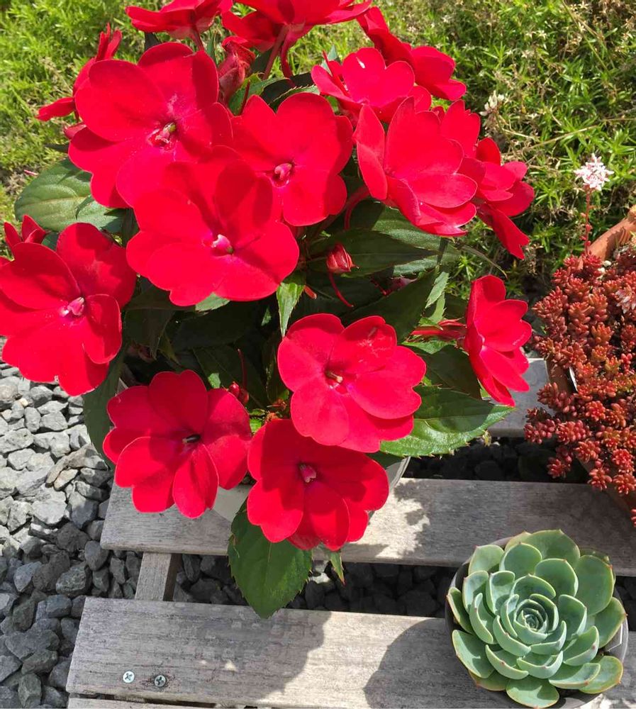 ばぁばぁさん サンパチェンス赤が華やかで引き立ててくれてますね。暫く綺麗で咲いてね😃