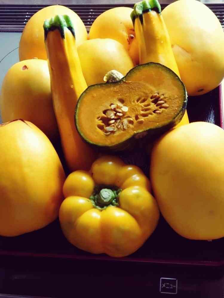 収穫した野菜を洗って並べていたら偶然黄色ばかりになりました。そこに、今晩のおかずになるカボチャをプラスしました🐰