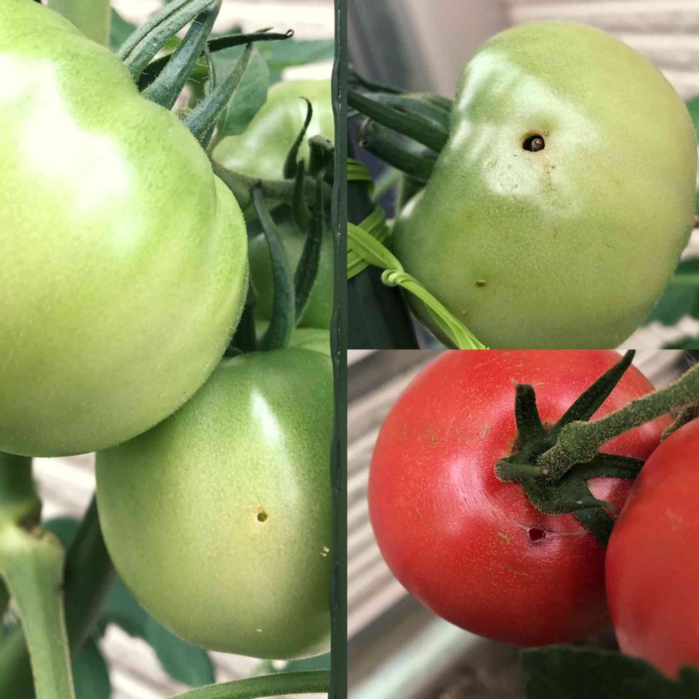 玉の形、大きさはまずまずなのだが、今朝見たらトマトに小さな穴が空いていた、コレは?この感じとうもろこし🌽のアワノメイガ🦋の穴の開け方に似ているなぁーと?