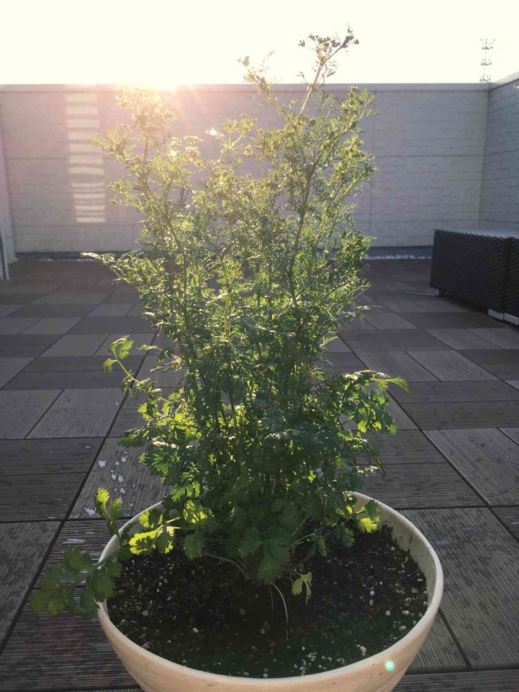 パクチーの背丈がすごく伸びた。先端に白い花も咲き始めてます。こうなるともう葉っぱは食べられないみたいなので、種収穫を楽しみにしてます。朝日が当たってさわやかやわ〜☀️