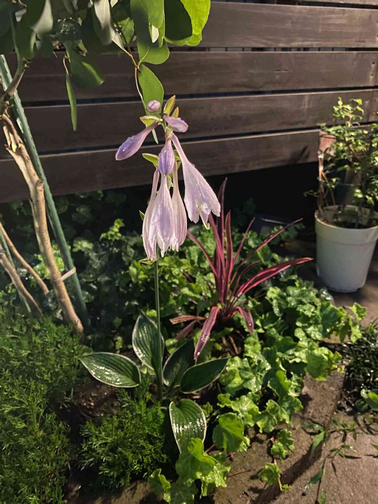 春に植えたばかりなのに、ホスタの日に綺麗に咲きました!雨で、夜ですが。