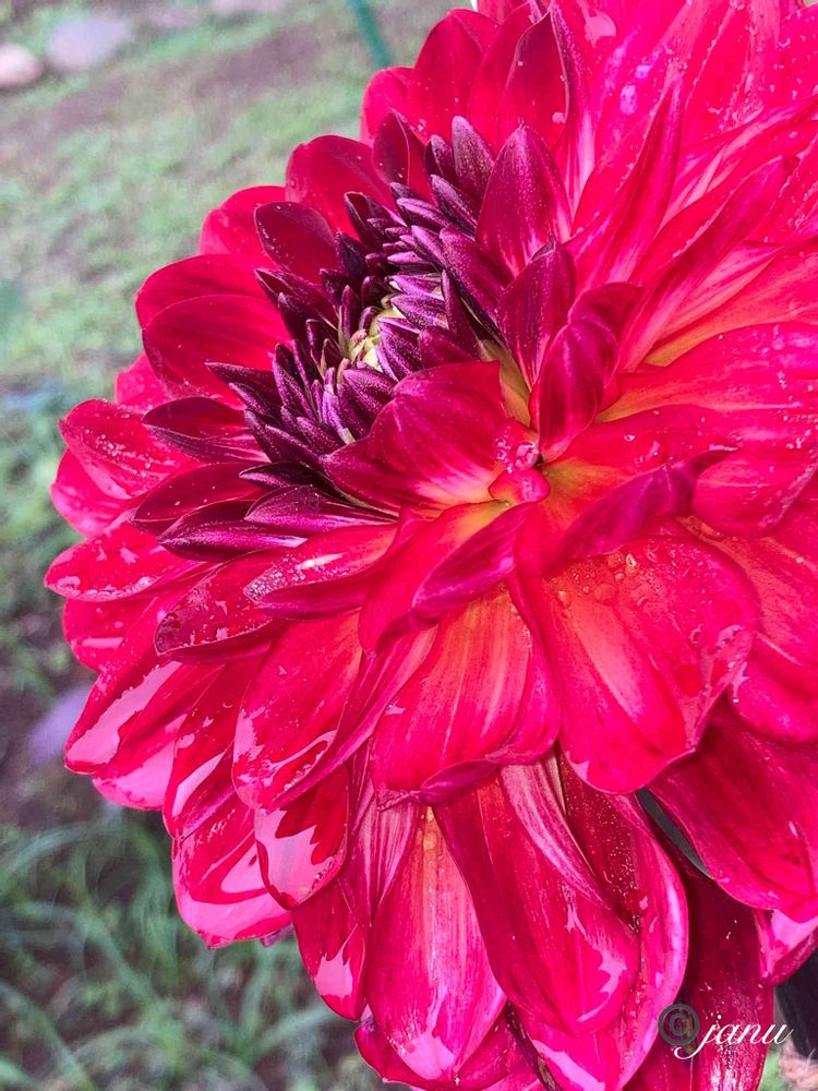 ロックンロールという名のダリア。滴さえ情熱的です。ダリア園にて。