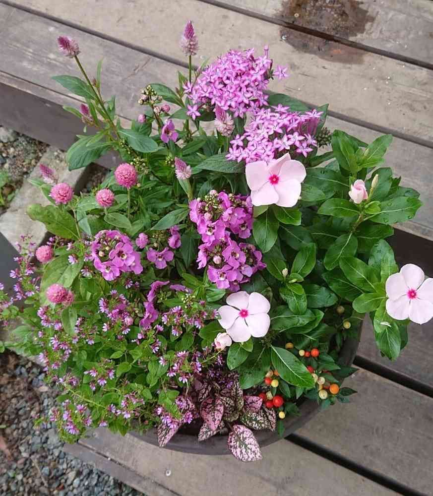 セロシア“サマーラベンダー”、ペンタス“ギャラクシーパープル”、センニチコウ“ラスベガスピンク”、栄養系アンゲロニア“アークエンジェルピンク”、クフェア“ピンクシマー”、ビンカ“バリアント”、観賞用トウガラシ“ポットポップスイエロー”、ヒポエステスです。