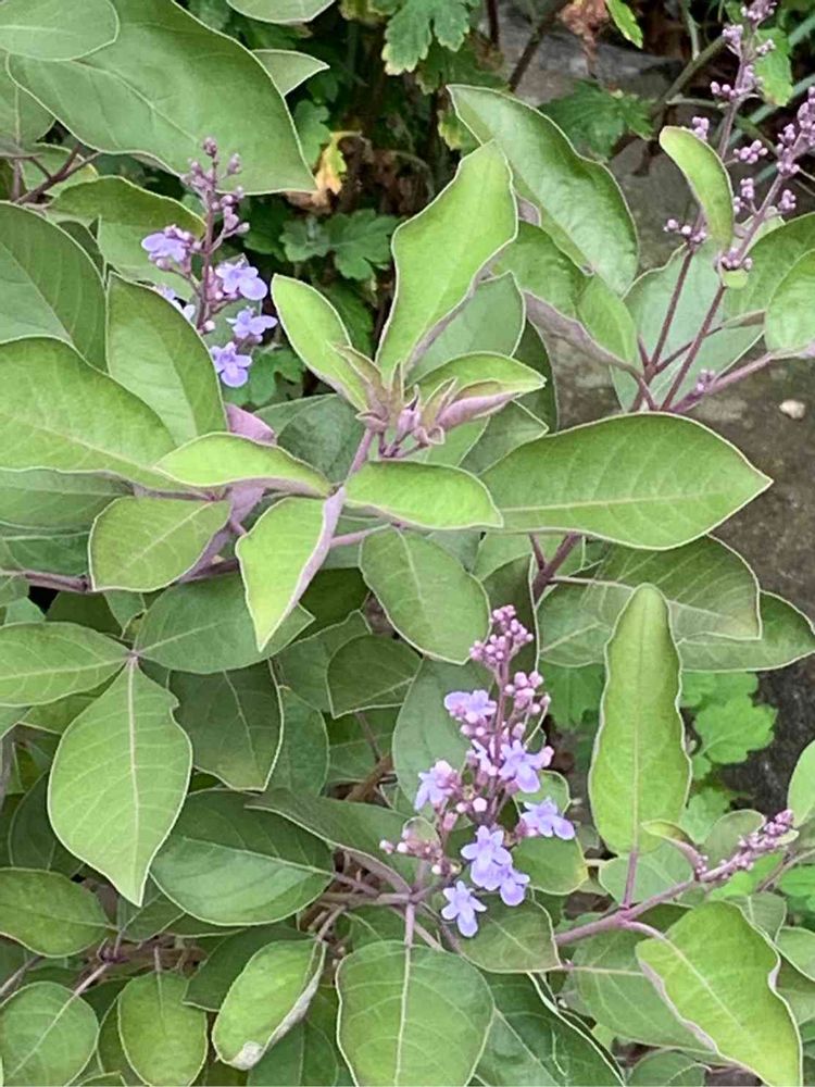 花房が立ち、薄紫のシソ科の花に似た花がたくさんついています。