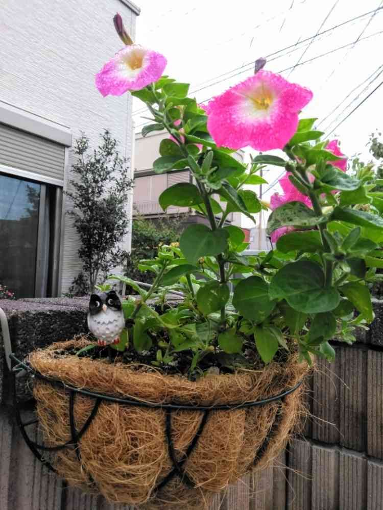 先日の朝の散策に、通り道のお宅の、玄関前の花壇の上の塀に、掛けられていました。