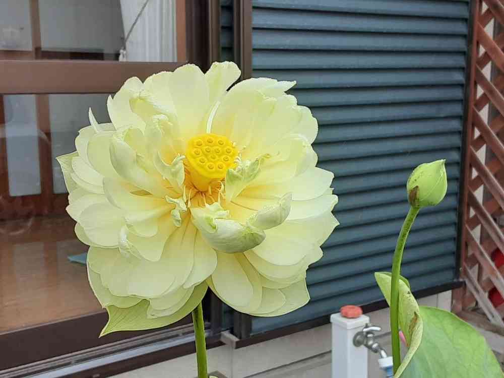 縁側の前の蓮鉢に植えてある黄色の蓮、昨日迄はつぼみでしたが、今朝開花しました。