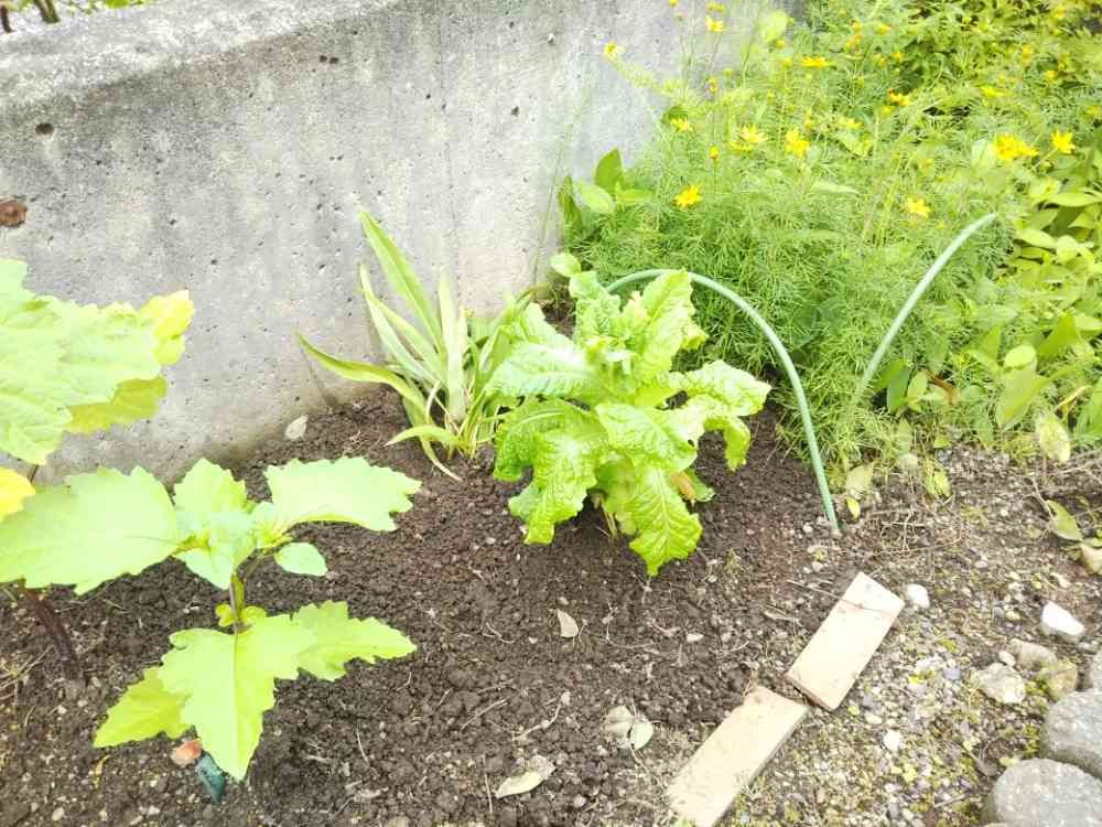 ストケシアらしい花と、地植えで「花を咲かせてね」とのサンチュ