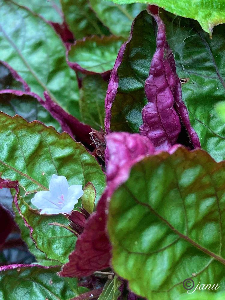 ヘミグラフィス エキゾティカHemigraphis Exotica. あざやかなリーフの中に真っ白な一日花、出会えました。