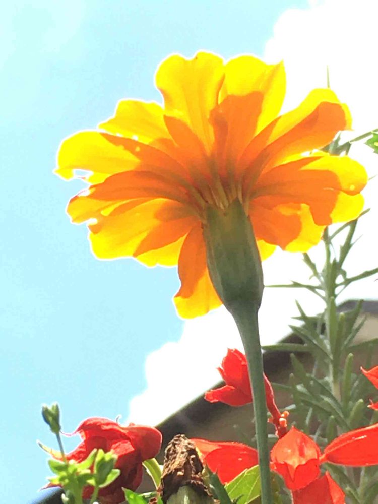 青空に顔を上げて咲くマリーゴールドの花弁が透けて美しい❥︎・•