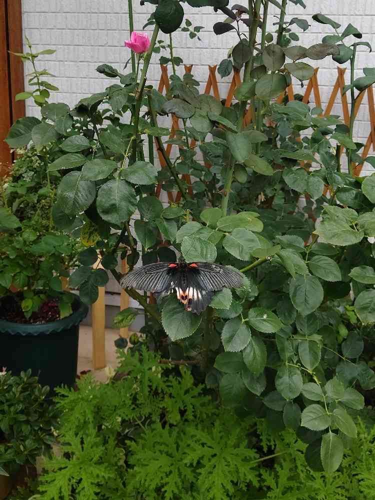 今日は ☔️は降ってないです。ヒラヒラと 飛んできて バラの葉に しばらくとまって羽を広げてじっとしてましたが また どこかに 飛んで行きました。