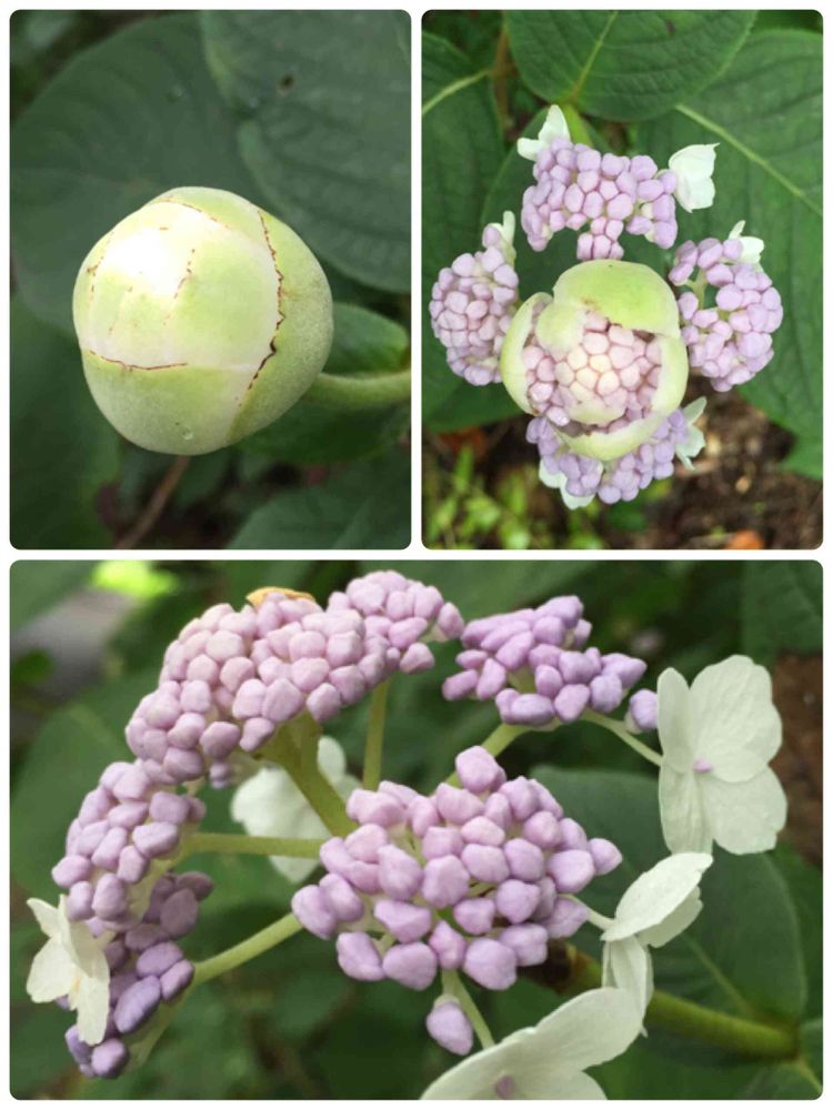 タマアジサイ白い大きな蕾から小さなピンクのまん丸な蕾ですか?お花かな?弾けてでてくるんですね面白いですね~😆👏✨