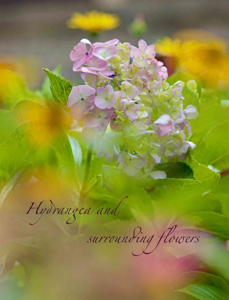 手前のピンクは額紫陽花だと思います