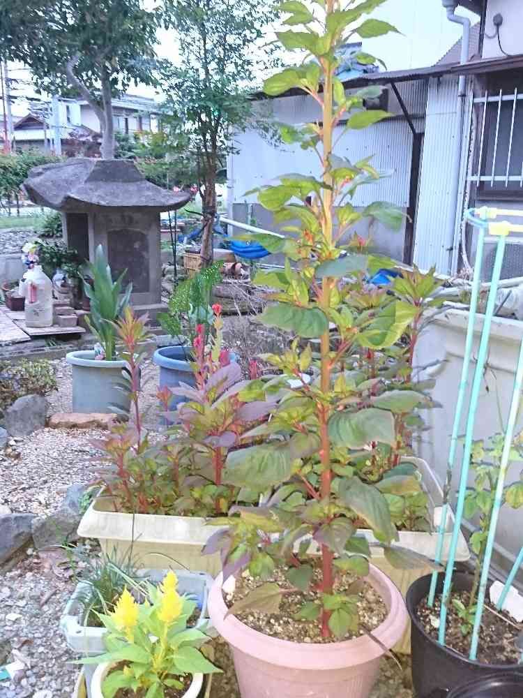 右のデッカイのが去年、頂いた赤色のケイトウ😱種が落ちて今年も発芽‼️伸び過ぎて😅
