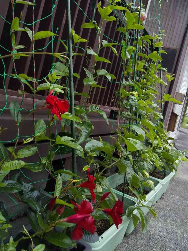 手前がマンデビラと奥のがパッションフルーツのグリーンカーテン仕立てです😃160センチの私より大きくなりました😃