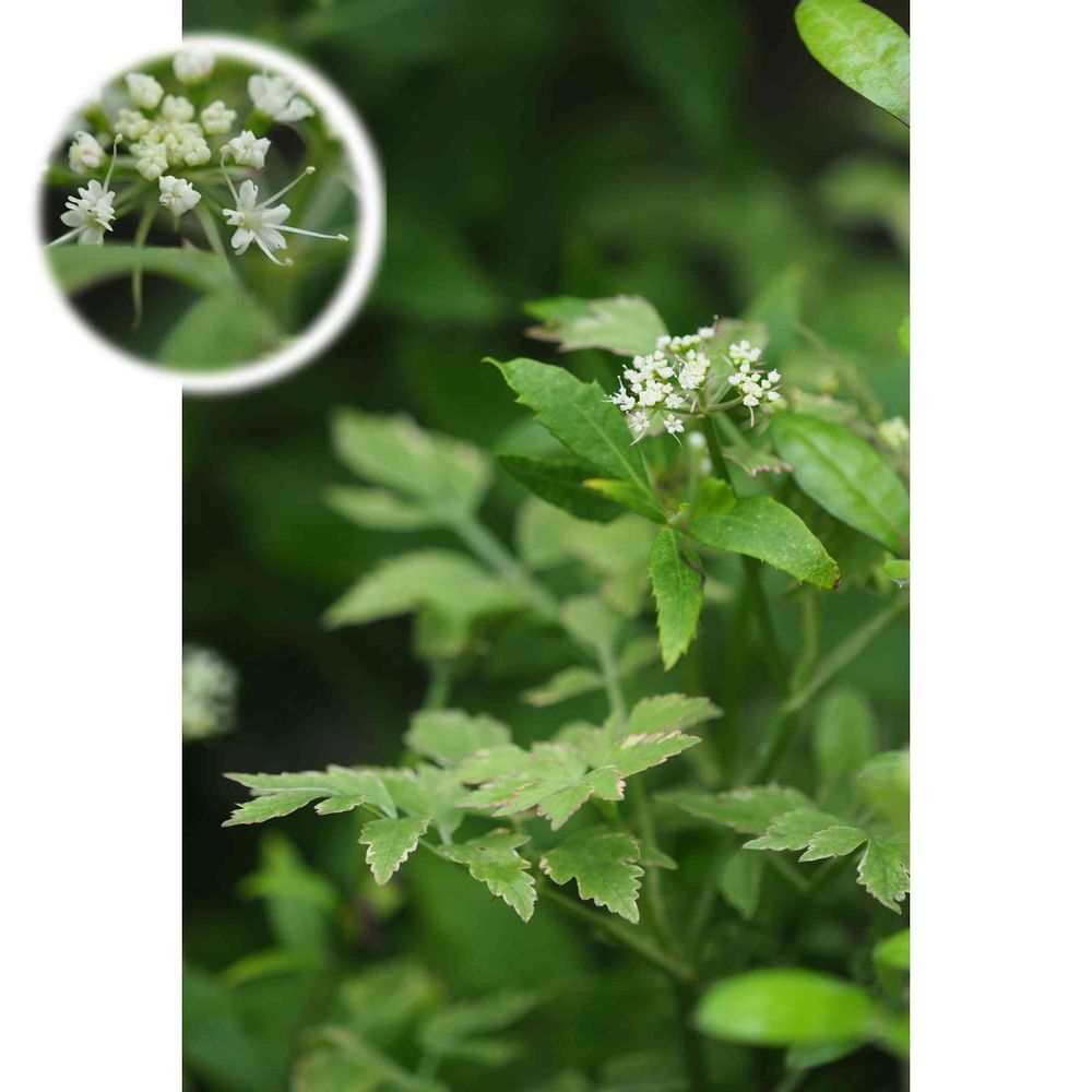 ピンクの斑が入るセリに花が咲きました~と言っても変わった花では無く、普通の白い花なんですが...