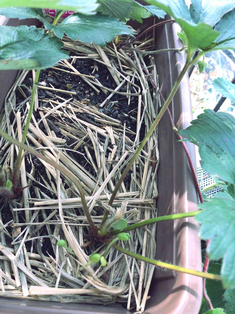 ベランダ暮らしの🍓のプランター、クラウンの側に 🌱芽🌱?何だろう......