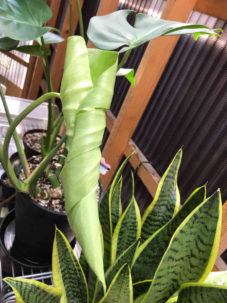 【モンステラ】、ポリカ波板に囲まれた物干し場で機嫌良く成長しています。