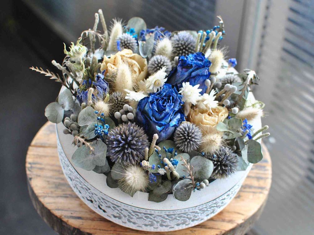 青のバラをメインにドライフラワーだけでアレンジしました♪