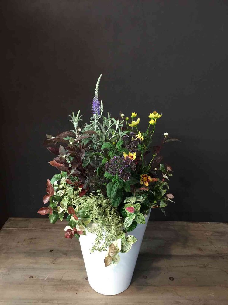 去年の秋にご指定の白鉢に寄せ植えしたもの。