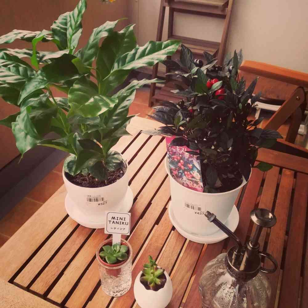 先月末(6/27)、初めて観葉植物を購入したときの写真です。左がコーヒーの木、右が観賞用トウガラシのオニキスレッド。
