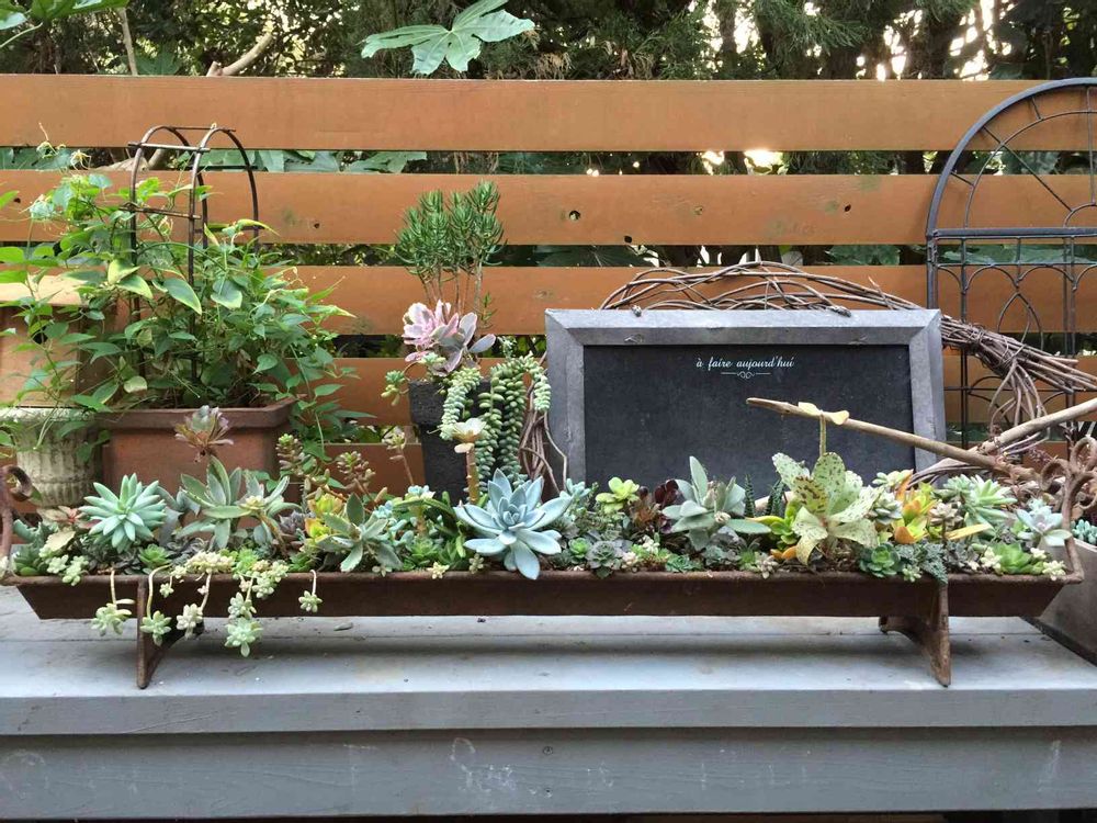 長いアイアンのコンテナに多肉の寄せ植え。1メートルくらいの長さです。