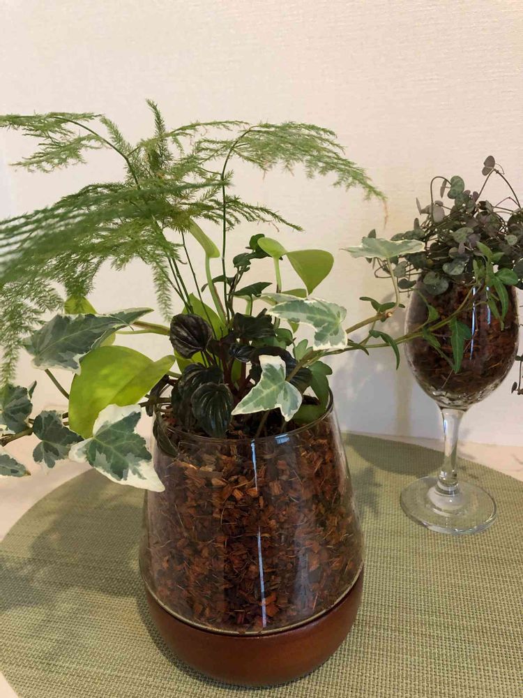 お気に入りお花屋さんにてガラスの花器を購入✨弱ってた観葉植物達🌿をベラボンで植えました😘
