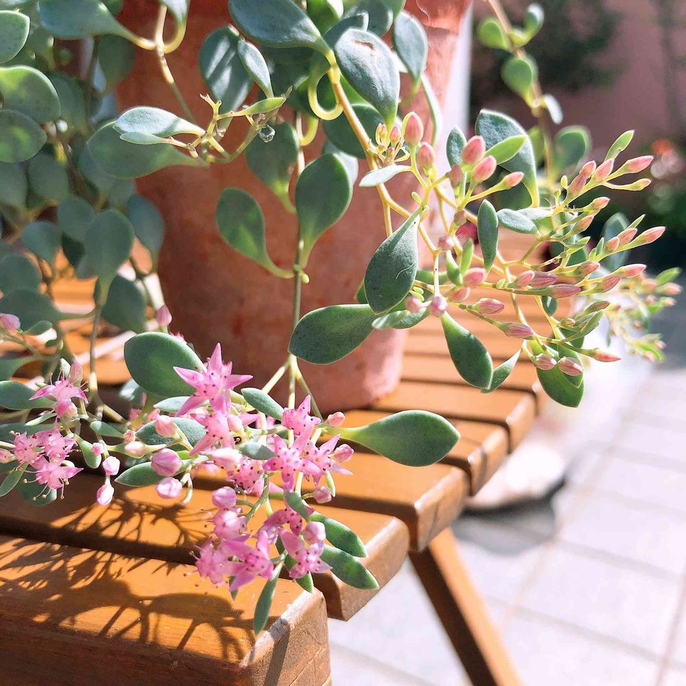 キッチンの窓辺に置いていたので徒長気味ですが……日高ミセバヤさんがお花を咲かせてくれています🌸✨✨