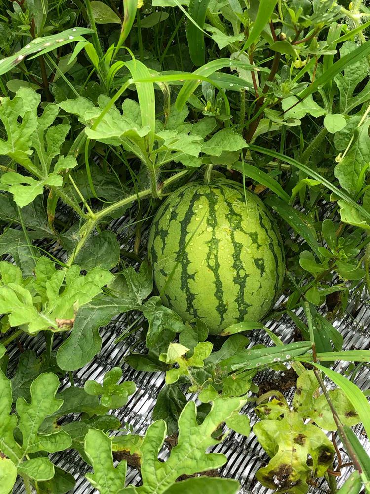 スイカ、長雨で実が付いても黄色くなってダメになっていたんだけど、ようやく一個だけまともに育ちそうです。