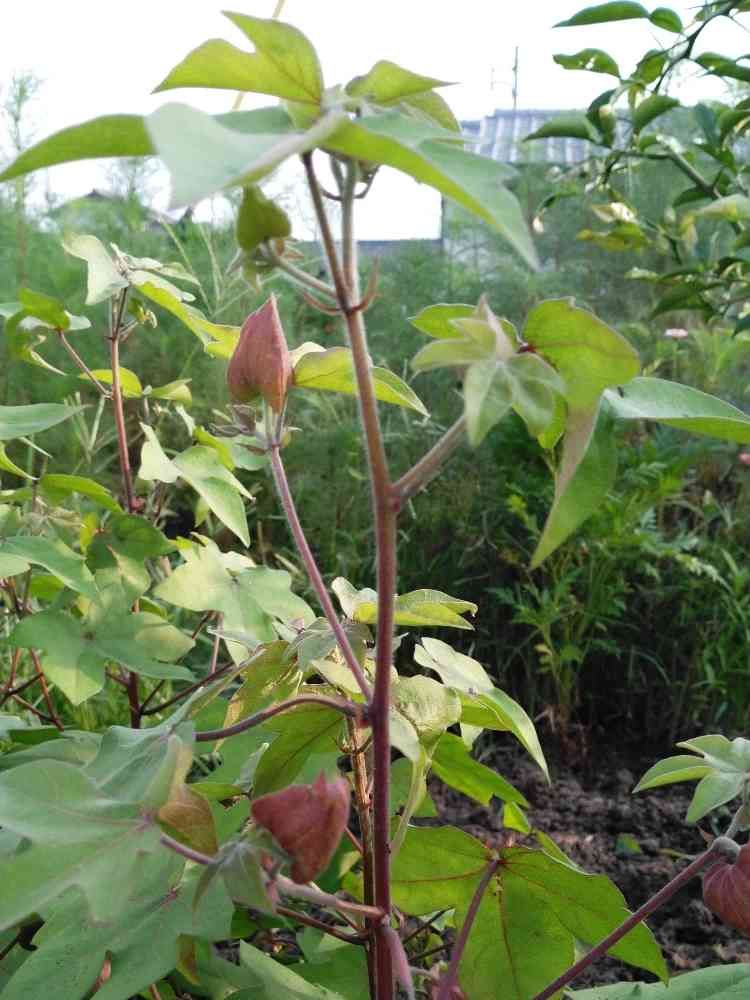 棉の硬い蕾がもう少しで弾けてそう。