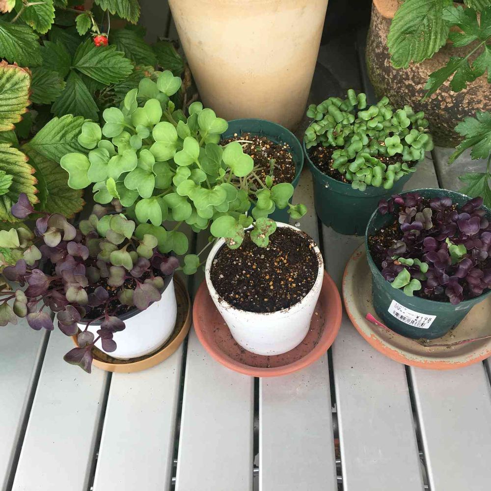 紫カイワレ大根がぐんぐん伸びています。前中央鉢は、昨日大阪四十日大根種を蒔きました。