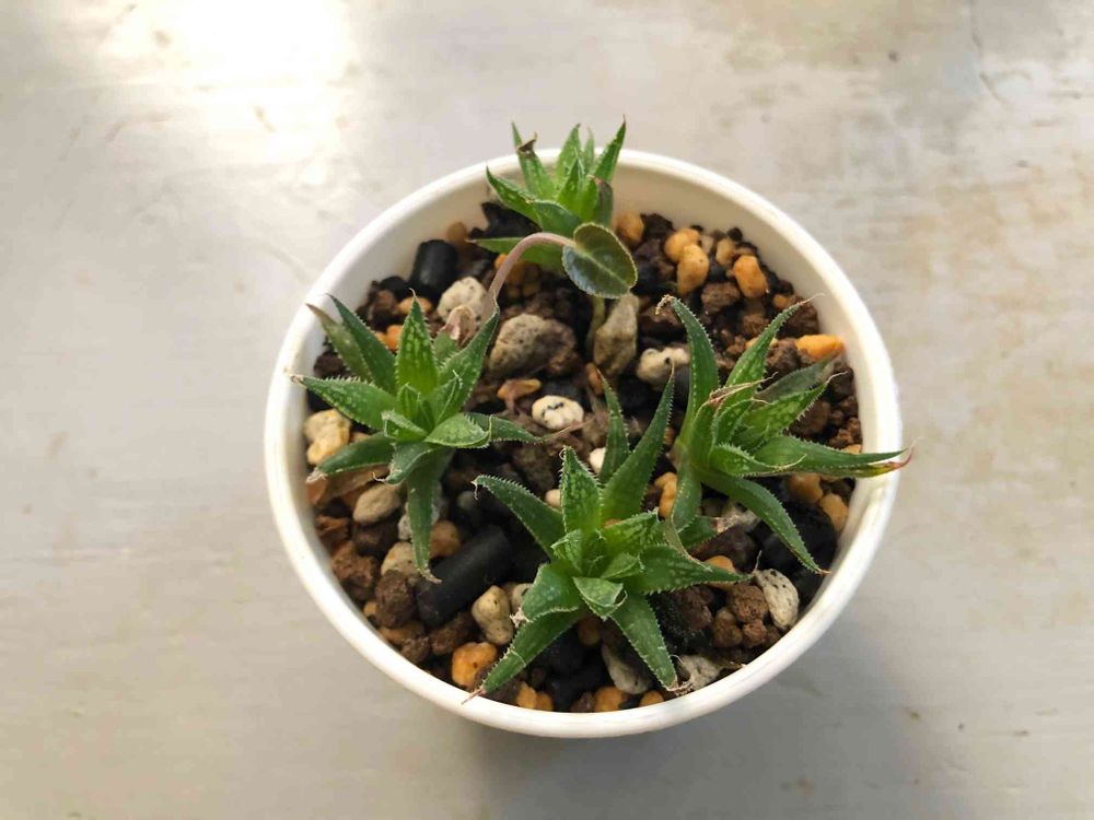 ハオルチアの間からシクラメンらしき芽が出てる。いつの間に入りこんだのか?