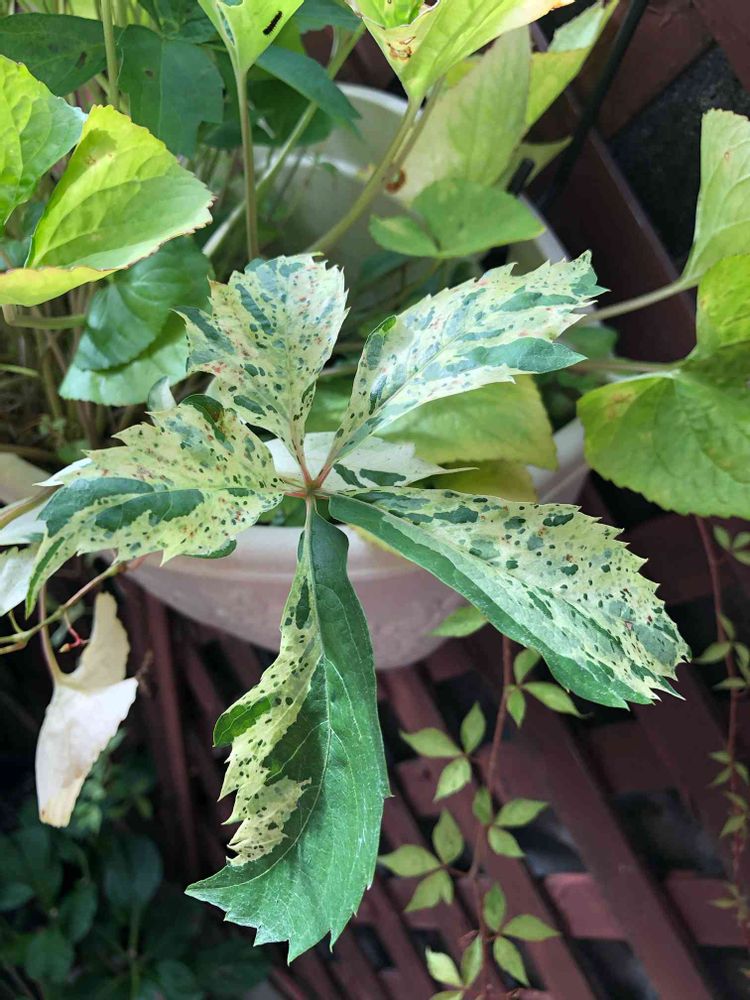 画面いっぱいに見える斑入りの葉っぱは、「斑入りアメリカヅタ」ではないでしょうか…?その後ろに見える「名前を教えて」の範囲に指定したのは同じものですか?それだと「ヘンリーヅタ」のようでもありますが…